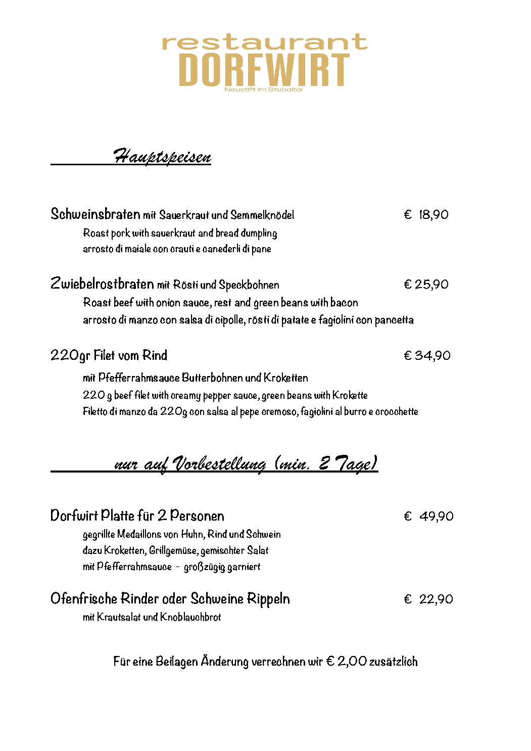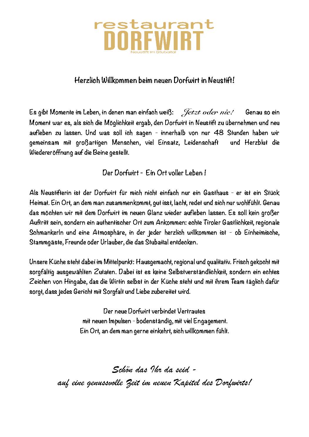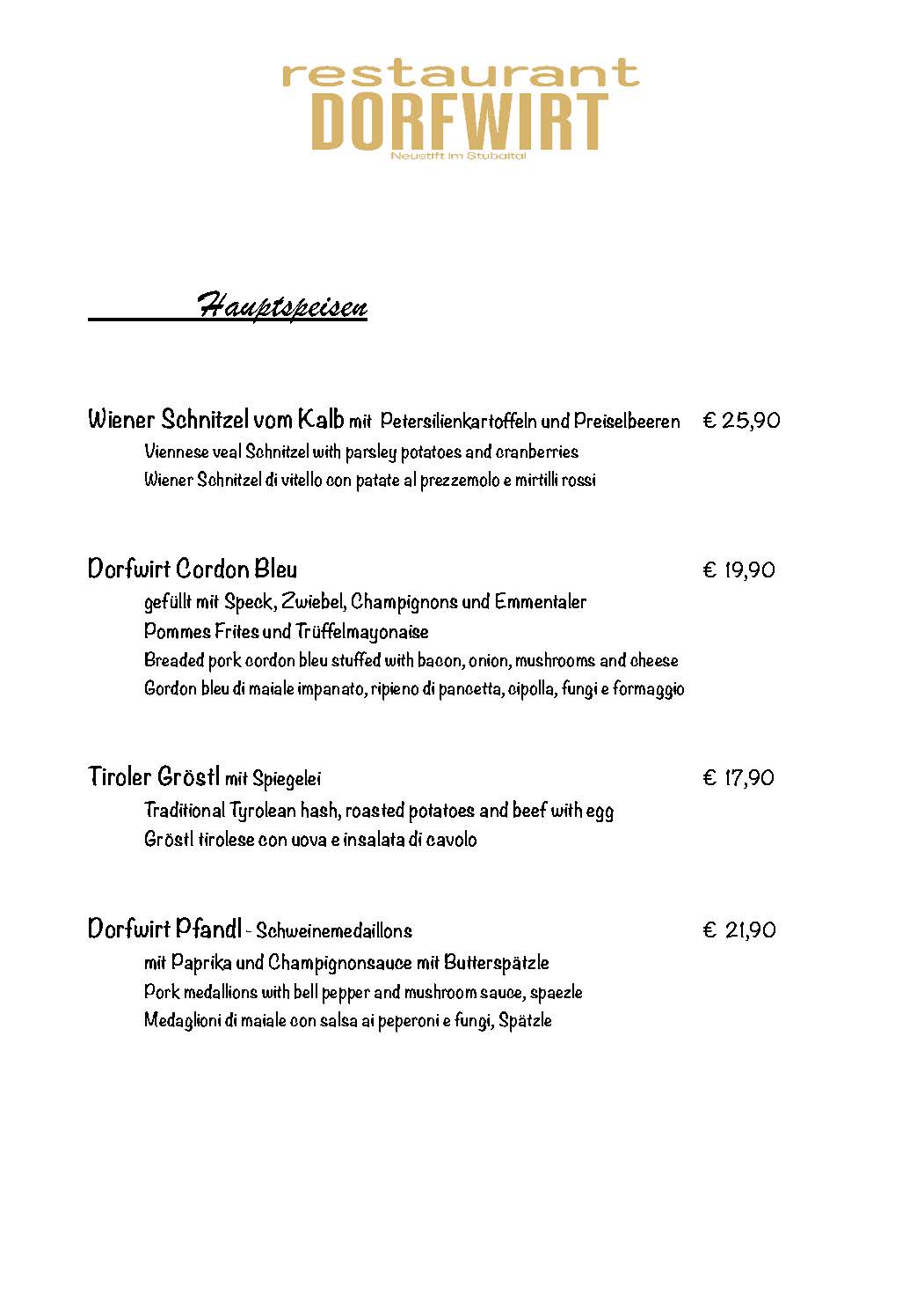 Im Restaurant Dorfwirt in Neustift im Stubaital genießt du mit allen Sinnen. Speisen kreieren wir aus frischen, hochwertigen Zutaten, die nicht nur gut schmecken, sondern auch köstlich duften. Wir kredenzen sie liebevoll angerichtet, so dass auch das Auge mitisst. Dazu empfehlen wir dir gerne erlesene Weine, würziges Bier oder Erfrischungen für den großen Durst.